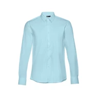 Long-sleeved men's shirt in 68% cotton, 28% polyamide and 4% elastane (115 g/m²). Long sleeve with 1 pleat and adjustable cuffs with 2 buttons. Placket with 7 buttons in matching colour. Sizes: S, M, L, XL, XXL