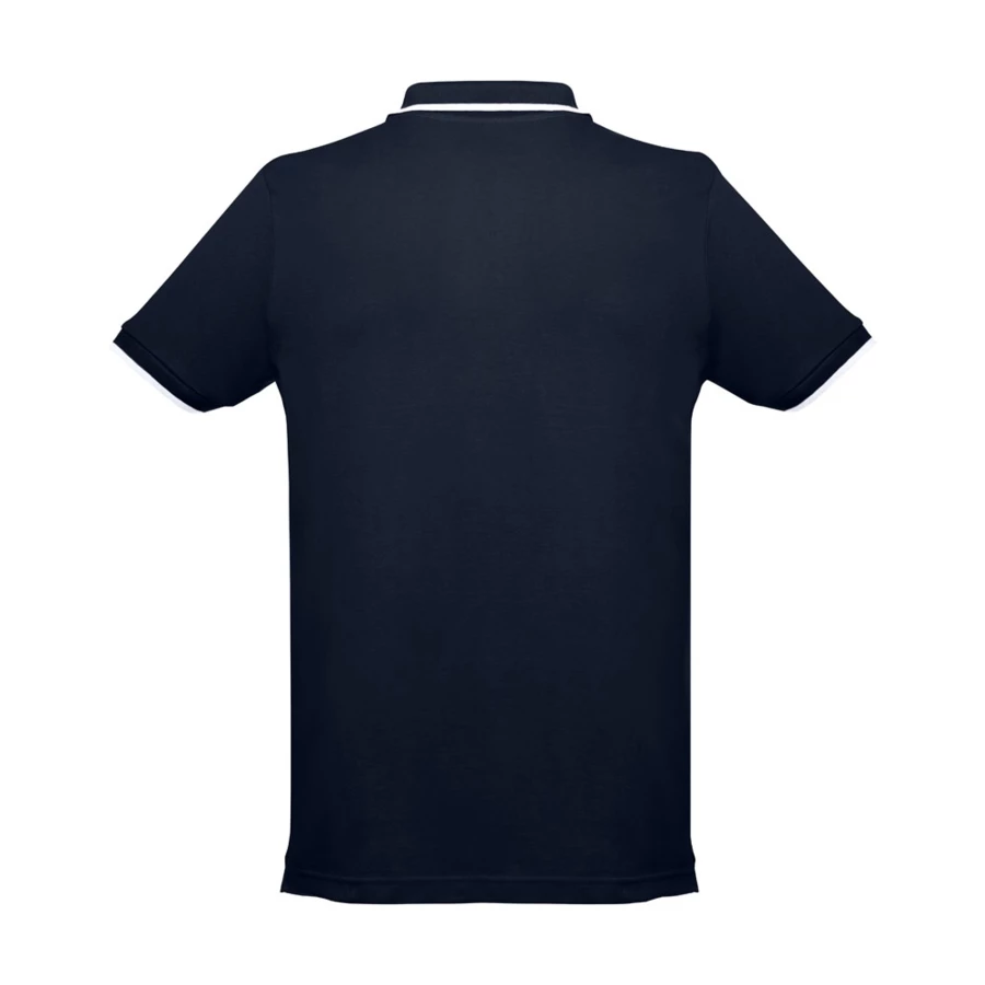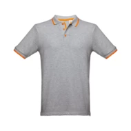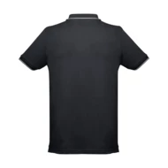Short-sleeved bicolour polo for men in piqué 100% cotton carded (210 g/m²) (colour: 183: 85% cotton/15% viscose). Two-colour contrast on the collar, sleeve and placket. Features a collar and cuffs in Rib. Reinforced placket with 3 contrasting colour buttons (extra button inserted in the inner side seam). Fitted waist and small side vents at the hemline of the polo. Sizes: S, M, L, XL, XXL