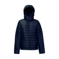 Women's hooded jacket in 100% recycled nylon ripstop (350 g/m²), the inside is lined in 100% recycled nylon taffeta (350 g/m²) for greater comfort when wearing it. The hood is padded and has different features: an elastic band, two snap buttons and a zipper that can be removed. Front opening with YKK® zipper - a brand that uses modern equipment with high quality control - and puller. It has two front pockets with zippers and pullers and two inside pockets with adhesive zippers. On the lower back there is a zippered access for easy personalization. Sizes: XS, S, M, L, XL, XXL