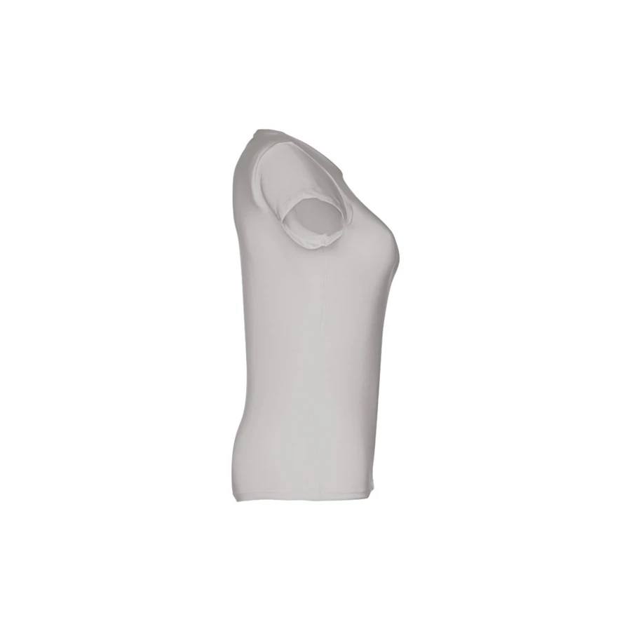 Women's fitted T-shirt in 100% cotton jersey knit (150 g/m²) with carded cotton yarn (colour 183: 90% cotton/10% viscose, colour 196: 98% cotton/2% viscose). Features a thin double collar in jersey reinforced by a satin bias tape. Cut and sewn garment with double stitched sleeve and hemline. Sizes: S, M, L, XL, XXL