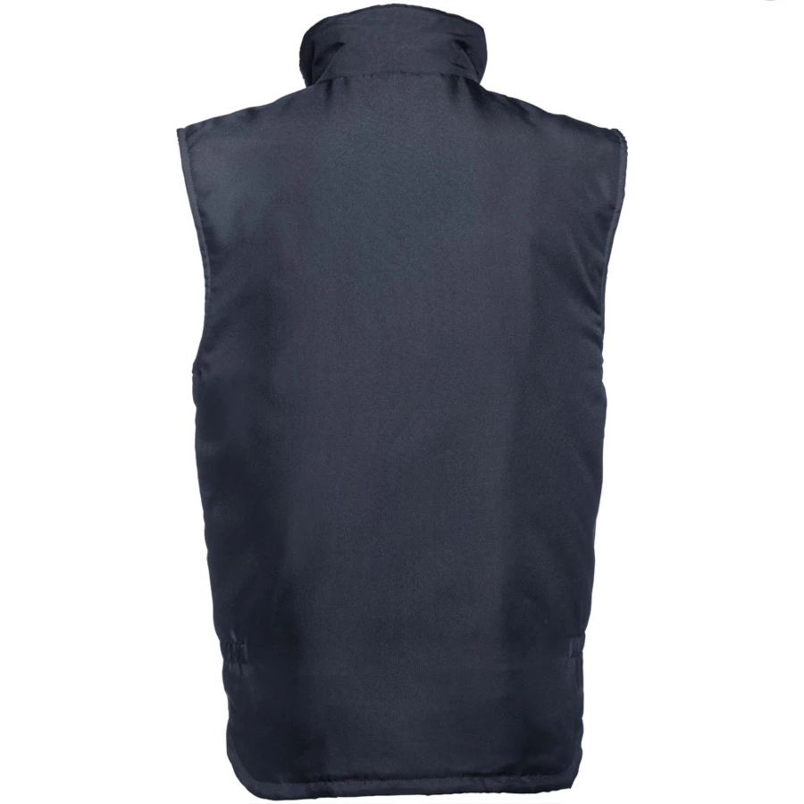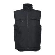 Men's padded work vest in 100% oxford polyester with an acrylic coating (170 g/m²), lined in 100% taffeta polyester (65 g/m²). Fleece lined collar and elastic sides for better fit. Contains 6 pockets: 5 front pockets, including 2 with inner zip plus 1 for mobile phone, and 1 inside pocket. Zipped access at the back for easy customisation. Sizes: S, M, L, XL, XXL, 3XL