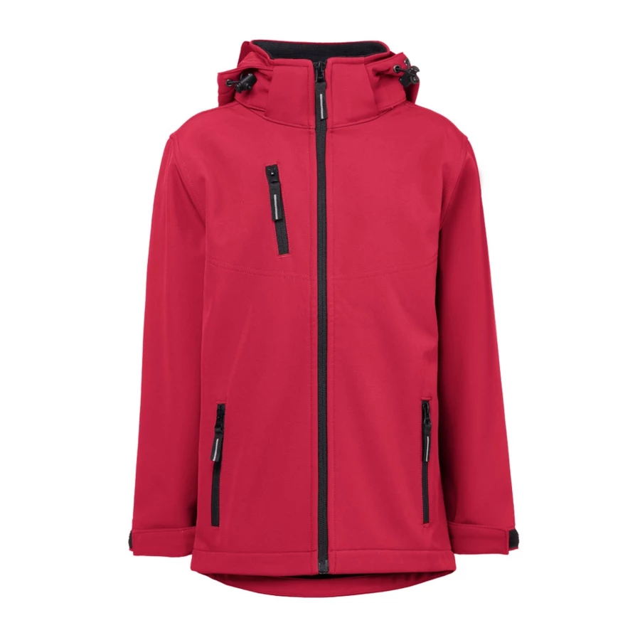 Children's jacket in 96% recycled polyester softshell and 4% elastane (280 g/m²), with two laces and water-resistant lining. Fleece-lined jacket (100% recycled polyester) with 2 front pockets and a diagonal chest pocket, both zippered. Removable and adjustable hood with drawstring and adhesive zipper strap to fit the collar. Front opening with YKK® zipper - a brand that uses modern equipment and high quality control. Adjustable cuffs with adhesive closure strap. Rounded lower back. Sizes: 4, 6, 8, 10, 12