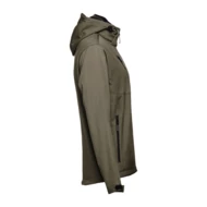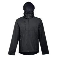 Softshell men's jacket in 96% polyester and 4% elastane (280 g/m²), with two layers, removable hood and water resistant coating. Fleece lined jacket with 2 front pockets and diagonal chest pocket, all with zips. Adjustable cuffs with self-adhesive hook and loop fastener. Removable hood with drawstring and self adhesive hook and loop fastener to attach to the collar. Rounded hem on the back. Sizes: S, M, L, XL, XXL