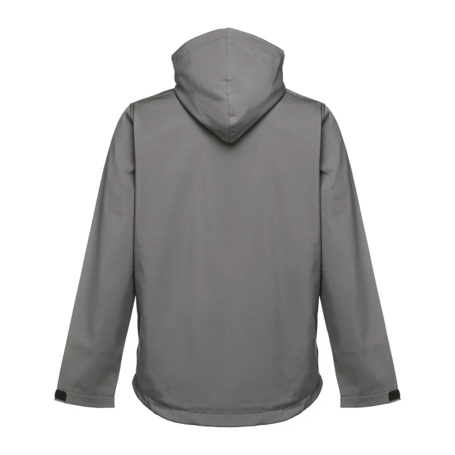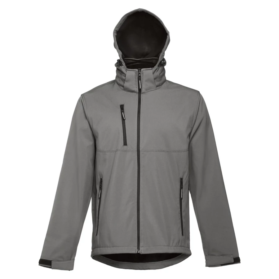 Softshell men's jacket in 96% polyester and 4% elastane (280 g/m²), with two layers, removable hood and water resistant coating. Fleece lined jacket with 2 front pockets and diagonal chest pocket, all with zips. Adjustable cuffs with self-adhesive hook and loop fastener. Removable hood with drawstring and self adhesive hook and loop fastener to attach to the collar. Rounded hem on the back. Sizes: S, M, L, XL, XXL