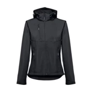 Softshell vest for women in 96% polyester and 4% elastane (280 g/m²), with two layers, removable hood and water-resistant coating. Lined jacket with 2 front pockets and diagonal chest pocket, all with zips. Adjustable cuffs with self-adhesive hook and loop fastener. Removable hood with drawstring and self-adhesive hook and loop fastener to attach to the collar. Rounded hem on the back. Sizes: S, M, L, XL, XXL