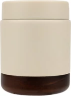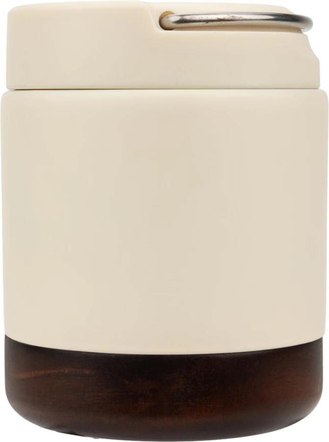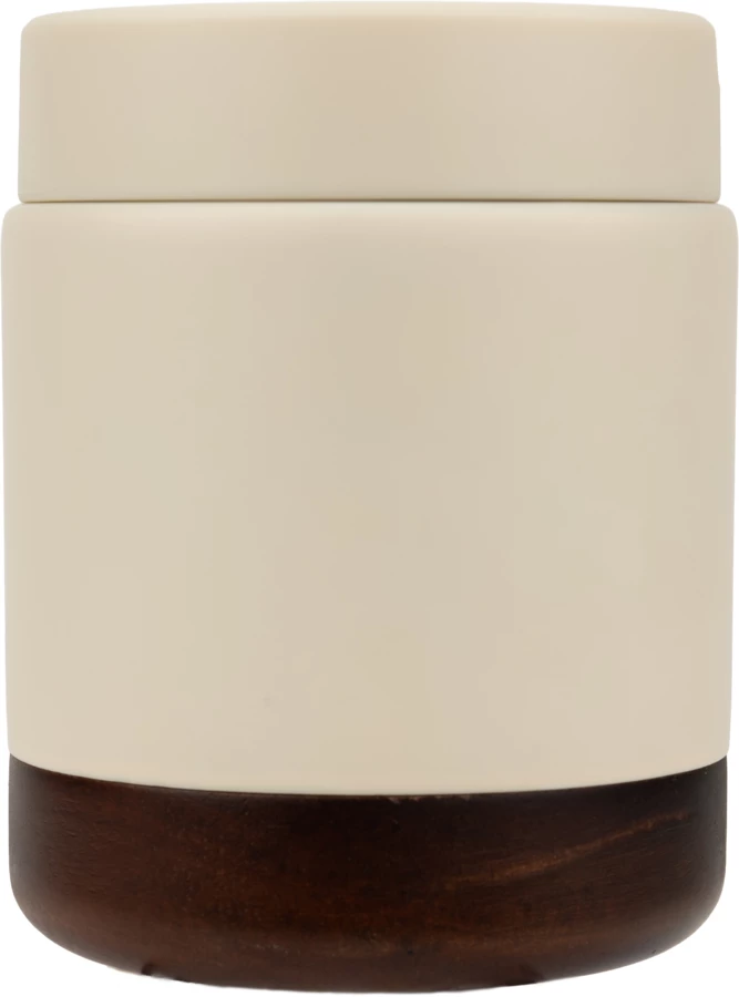 Double-walled thermal box made of recycled stainless steel. It has a screw-on lid with acacia wood and a carrying handle. After removing the wooden cap, box can be washed in a dishwasher. Capacity 400 ml.