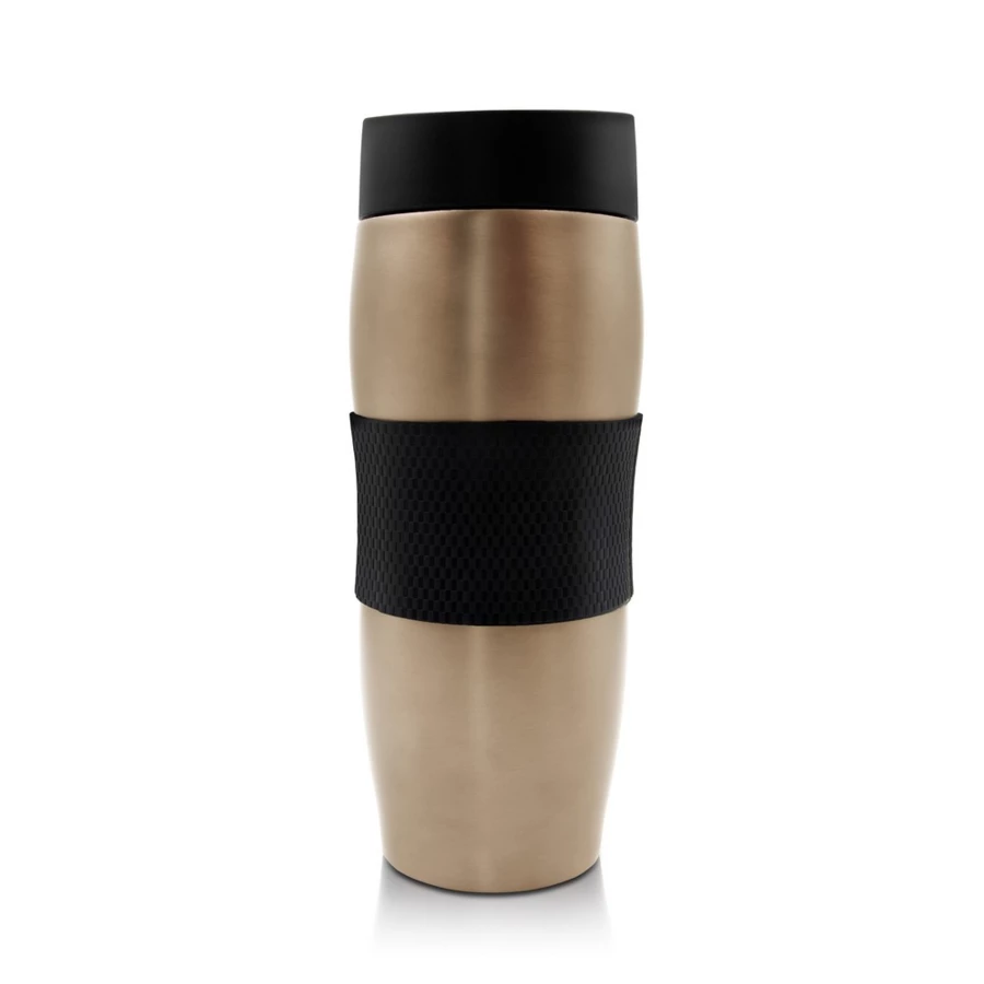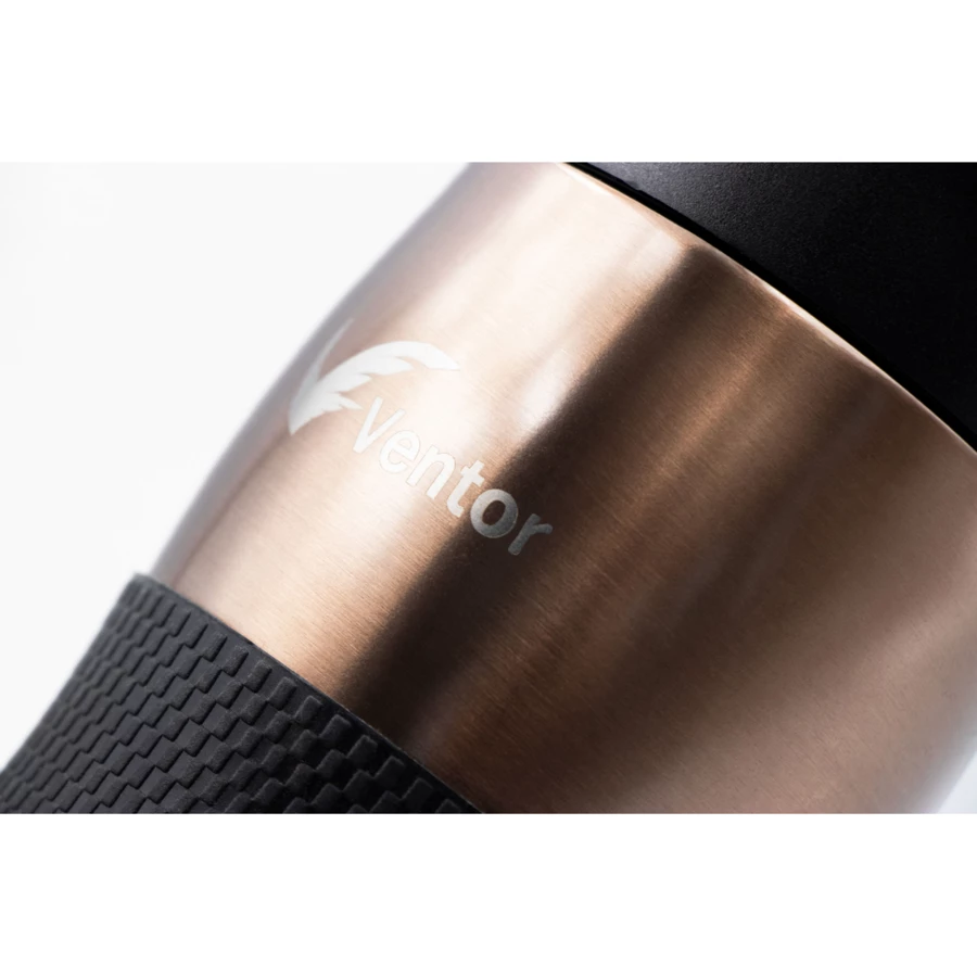 Air Gifts thermo mug 375 ml, features stainless steel double walls with copper and vacuum insulation that slow down the release of temperature to the surroundings, functioning like a thermos, plastic lid with a button to open/close the mouthpiece, enabling one-handed use, rubber grip for more comfortable handling, semi-matte finish, keeps beverages hot for up to 15 hours +leakproof