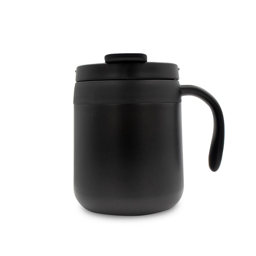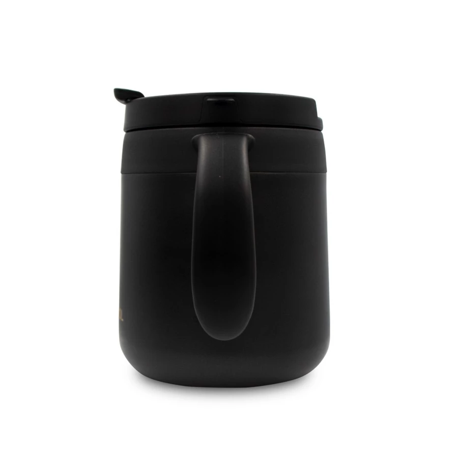 Thermo mug 400 ml with handle, features stainless steel double walls with vacuum insulation that slow down the release of temperature to the surroundings, functioning like a thermos, plastic lid with closure, enabling one-handed use, matte finish, keeps beverages hot for up to 10 hours