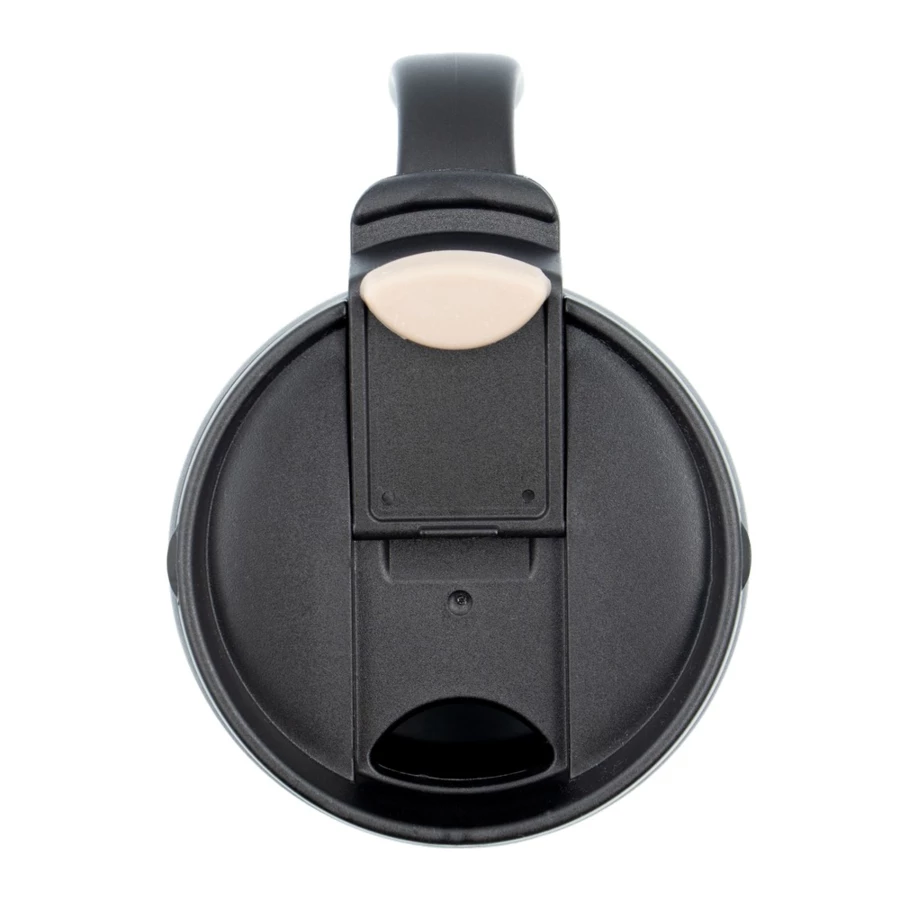 Thermo mug 400 ml with handle, double vacuum walled, stainless steel inside and outside, plastic lid, suitable for single hand operation, mat finish, thermal insulation scale: 2