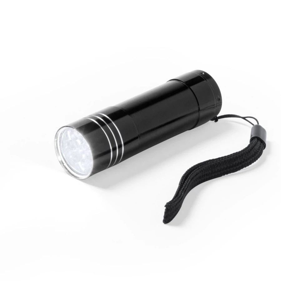 9 LED flashlight with high lighting power. With resistant aluminum body, protected push-up with resistant rubber coating and carrying strap. Battery power supply: 3xAAA not included. Presented in an individual box.