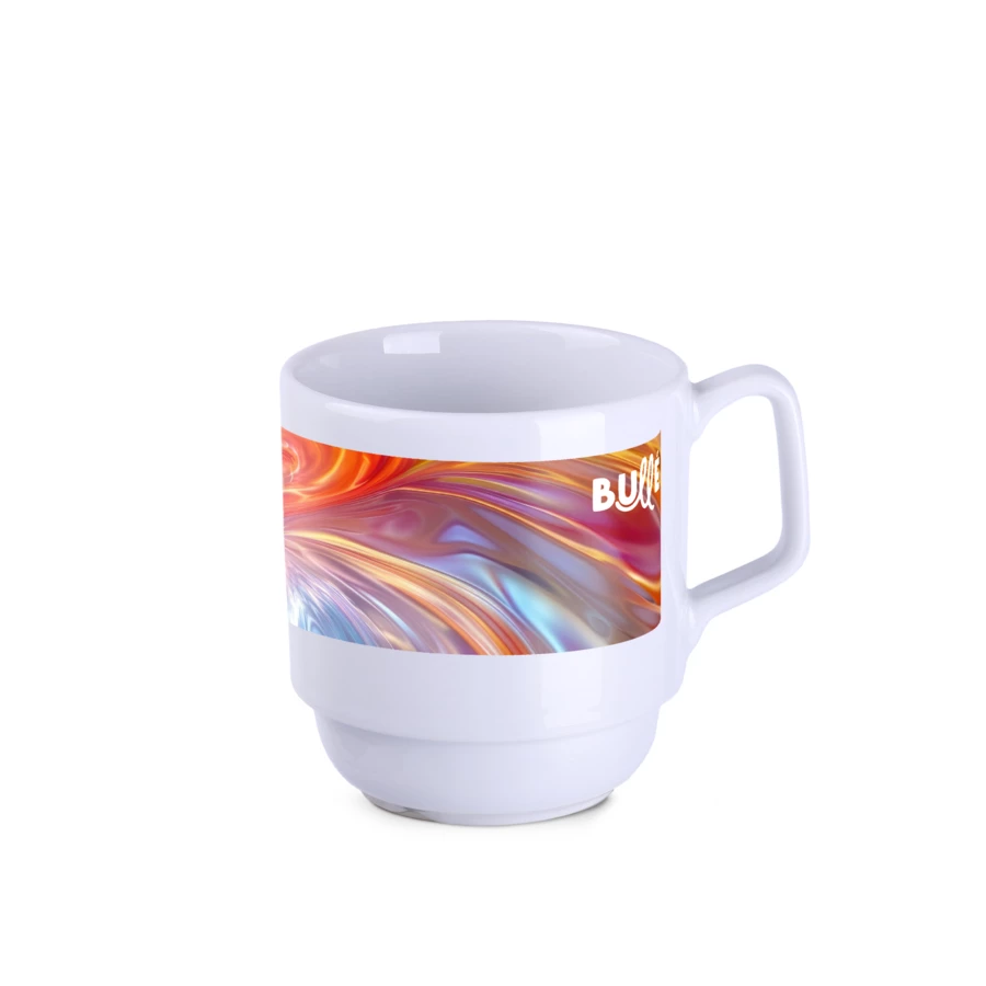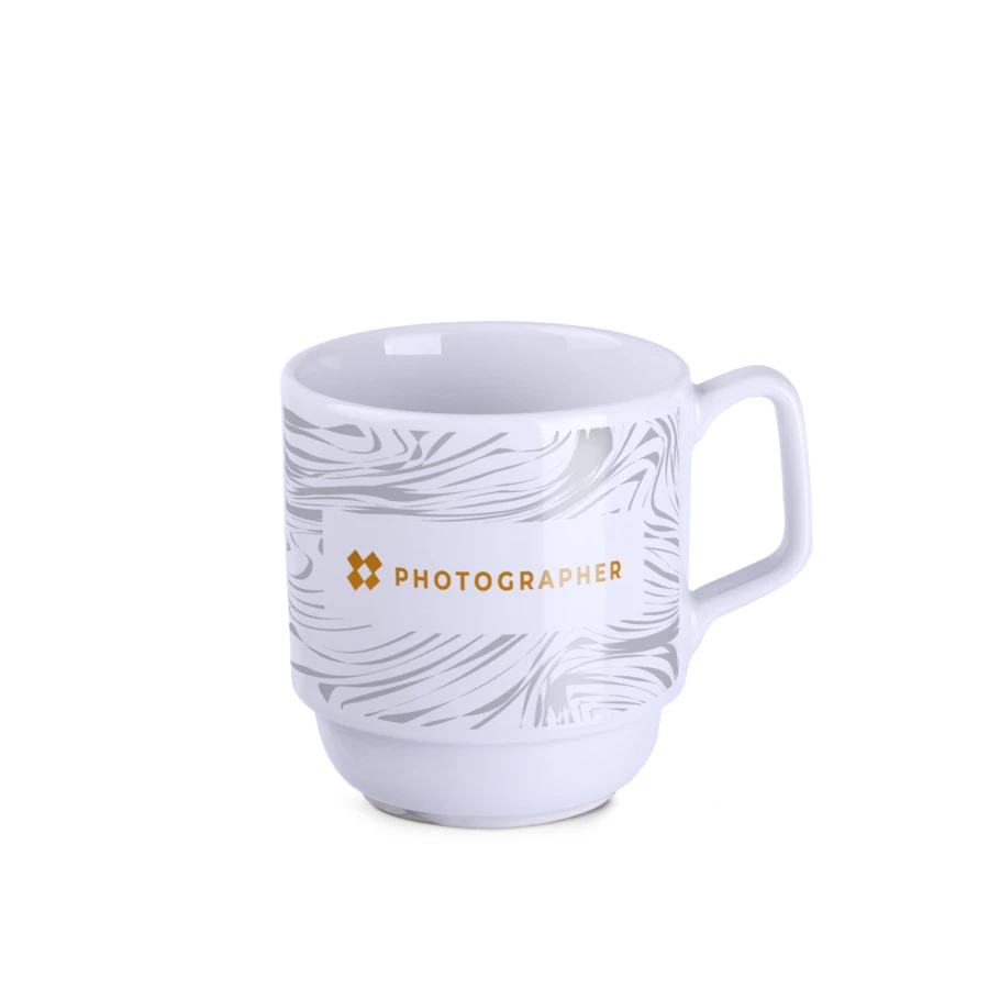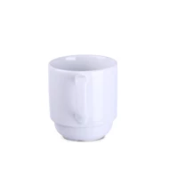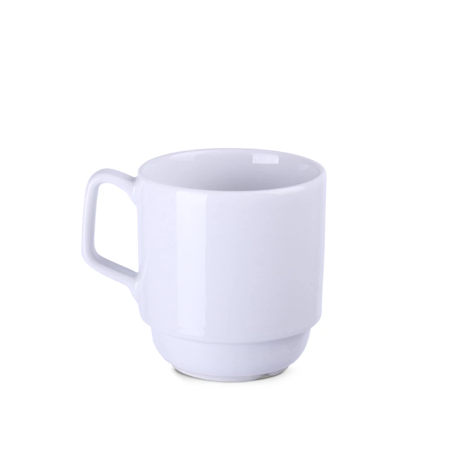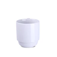 Porcelain mug with an original design. Its shape allows for stacking. It has special channels on the bottom that allow water remaining after washing in the dishwasher to be drained away. Produced in Europe.