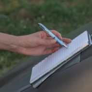 Pen made of recycled plastic (recycled PET), transparent, with silver accents and rubber on the barrel.