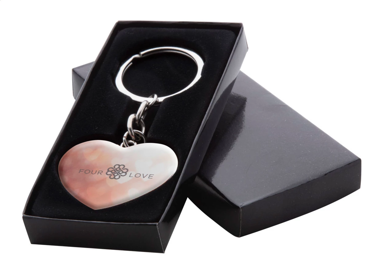 Heart shaped metal keyring, in black gift box.