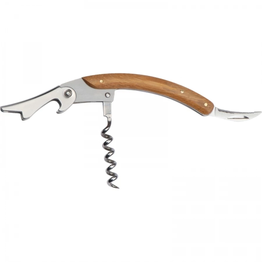 Waiter's knife made of metal and bamboo with bottle opener, foil cutter and a corkscrew with 2 lifting levels. Your logo will be engraved onto the bamboo surface.