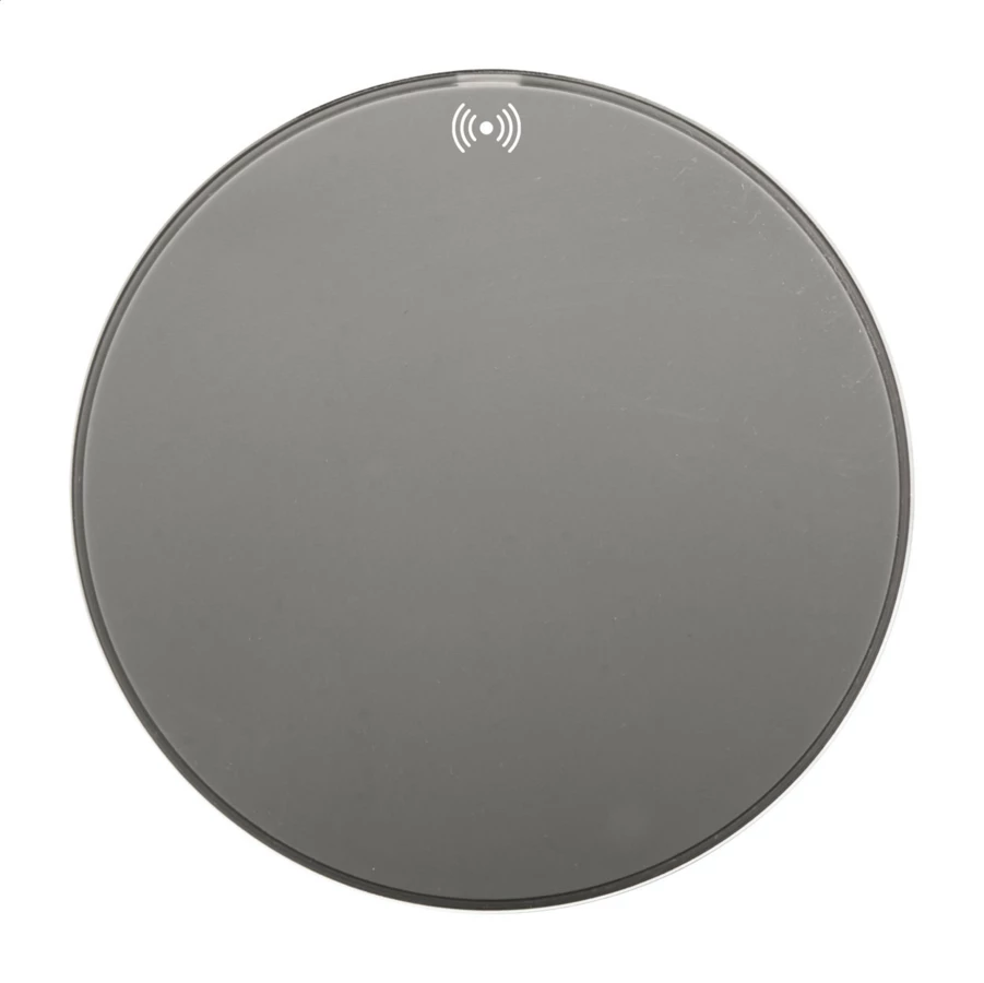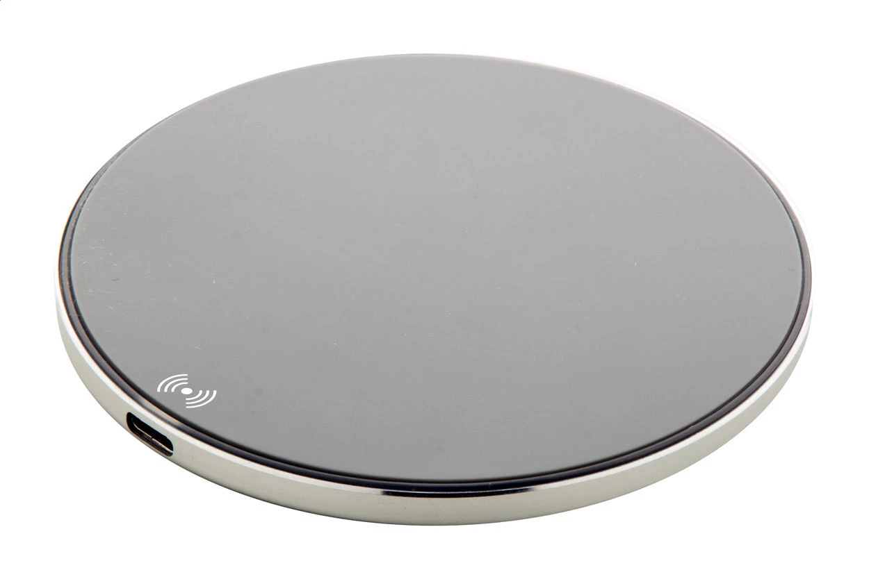 Recycled aluminium wireless fast charger (15W). Including USB charger cable.