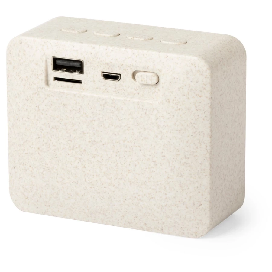 Nature line, Bluetooth® 5.0 docking speaker. Shell in wheat straw, to encourage the use of natural raw materials and reducing contaminant emissions, With 3W sound power, with USB player. Compatible with iOS and Android, includes a micro USB charging cable and comes in an individual eco design box. With non-slip rubbers at the base.