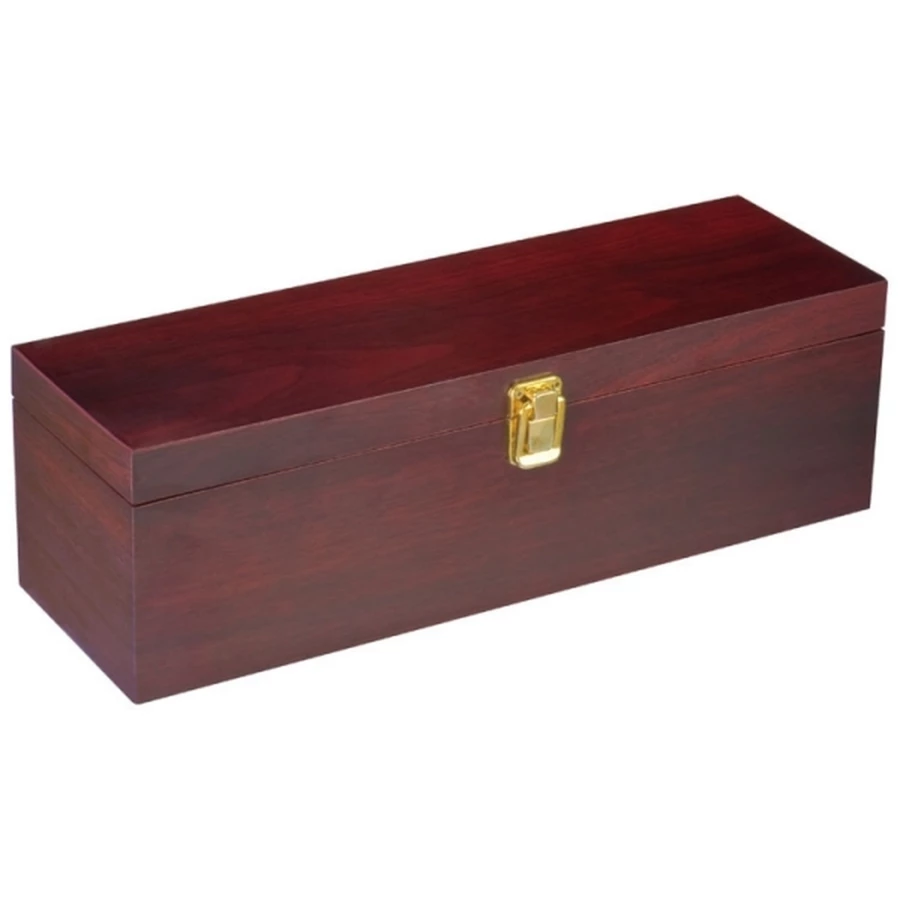 Stylish wine box equipped with a waiter's knife, a drip ring, a metal bottle stopper and a pourer with cap. Your logo will be placed on the lid bottom right preferably in gold.