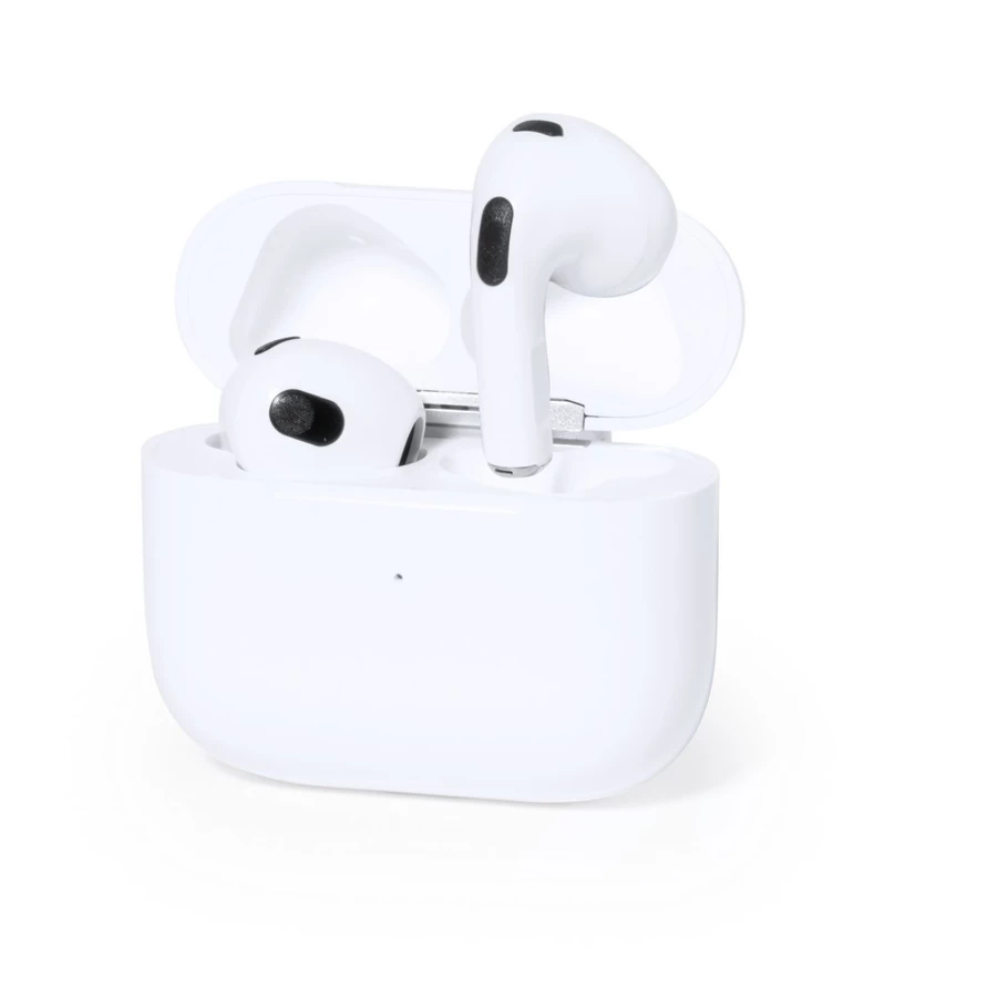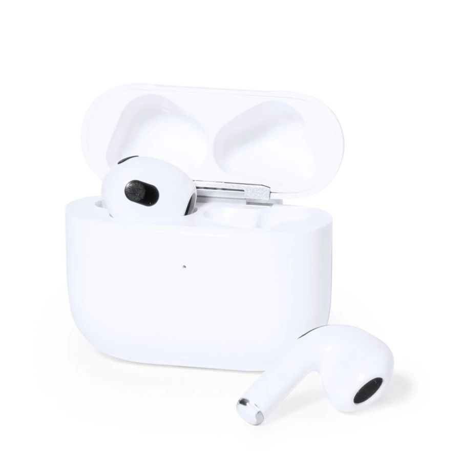 Earphones with Bluetooth® 5.3 connection and hands-free function. Ergonomically designed, including touch control button integrated in the earpiece, with matching charging base. Built-in 300 mAh battery and presented in an individual kraft design box. Instruction manual in English and Spanish.