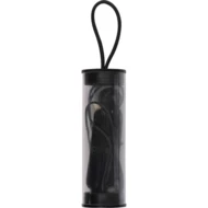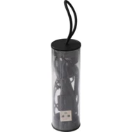 Bluetooth headset with volume control and USB charging cable in a plastic case with hanging loop. We will print your logo on the case.