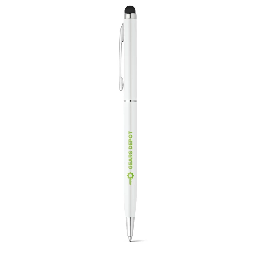Aluminium ball pen with twist mechanism, clip and touch tip. Blue ink. ø8 x 135 mm
