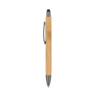 Bamboo ball pen with a metal clip, PP elements and matt finish. Features a touch tip. Black ink. As the product is made from natural materials, the colour and the printing result may vary between products. Ø11 x 141 mm