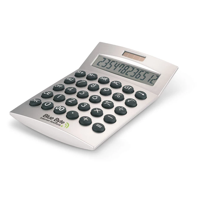 12-cyfrowy kalkulator na baterie słoneczne. Obudowa plastikowa. 1 bateria dołączona.
