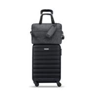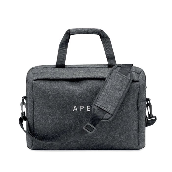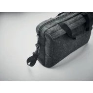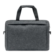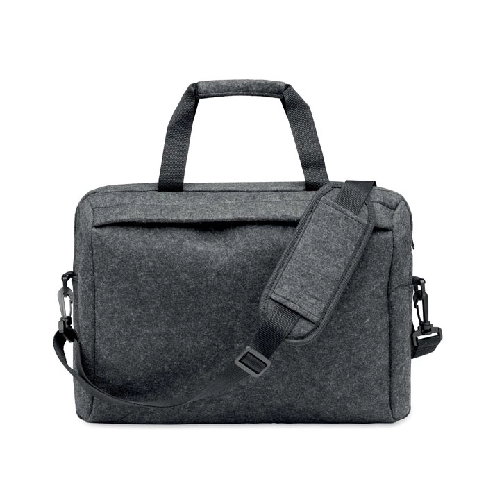 15-calowa torba na laptopa z filcu RPET z jedną główną przegrodą wewnętrzną i jedną zapinaną na zamek kieszenią przednią. Odpinany i regulowany pasek na ramię. Pasek na walizkę z tyłu.