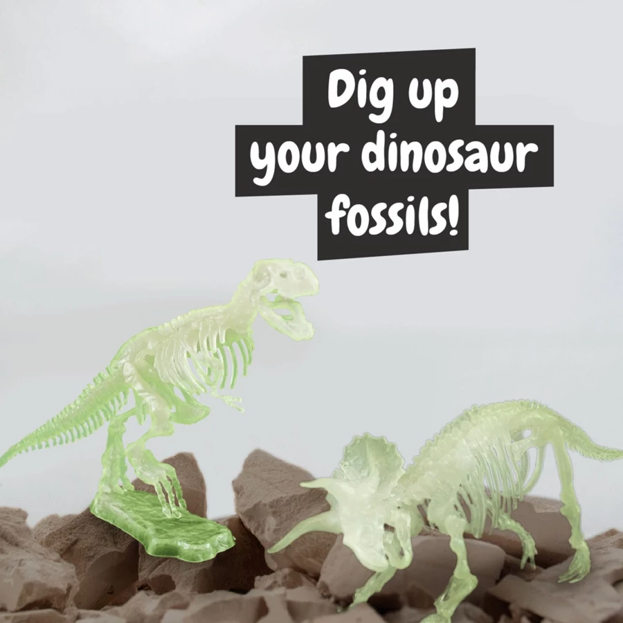 Zestaw edukacyjny 2 w 1 Dinosaur Fossil Excavations z instrukcją obsługi dinozaura. Ten zestaw do wykopalisk 2 w 1 pozwala wykopać i złożyć dwie skamieniałości ulubionych dinozaurów - T-rexa i Triceratopsa - które świecą w ciemności. Baw się, ucząc się najlepszych technik wykopalisk i dowiadując się, co spowodowało wyginięcie dinozaurów. Zalecany wiek: 6+ lat 263 x 220 x 62 mm
