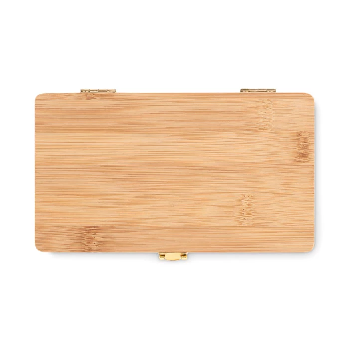 Poręczny 21-częściowy zestaw narzędzi w naturalnym, bambusowym etui. Idealny prezent dla majsterkowicza lub stolarza amatora. W tym przydatnym pudełku znajdują się wszystkie niezbędne narzędzia, które warto mieć w swoim domu na wypadek konieczności napraw lub realizacji małych projektów. Zawiera 3 śrubokręty, 10 bitów w uchwycie, 4 klucze nasadowe, 1 nóż do tapet, 1 uchwyt zapadkowy i 1 łącznik. Bambus jest produktem naturalnym, mogą występować niewielkie różnice w kolorze i rozmiarze poszczególnych elementów, co może mieć wpływ na końcowy efekt dekoracji. Wymiary pudełka 19,5x11,8x3 cm. FSC®-certified | FSC 100%, N5.7, FSC-C213206