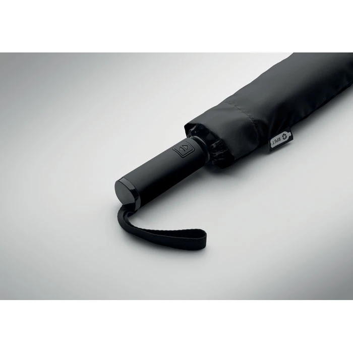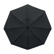 23-calowa, 3-częściowa parasolka z odwróconym mechanizmem, odporna na wiatr, wykonana z tkaniny pongee 190T RPET, z dopasowanym etui. Automatyczne otwieranie i zamykanie, całkowicie czarna rama, żebra