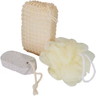 Zestaw akcesoriów kąpielowych składający się z 3 elementów, w tym kuli/gąbki luffa do kąpieli, pumeksu i konopnej myjki sizalowej. Rozmiar kuli/gąbki do kąpieli luffa: 9 cm. Wielkość pumeksu: 9,5 x 4,5 x 1,5 cm. Rozmiar myjki konopnej: 14 x 8 x 5 cm. Dostarczane w etui z bawełny pochodzącej z recyklingu.