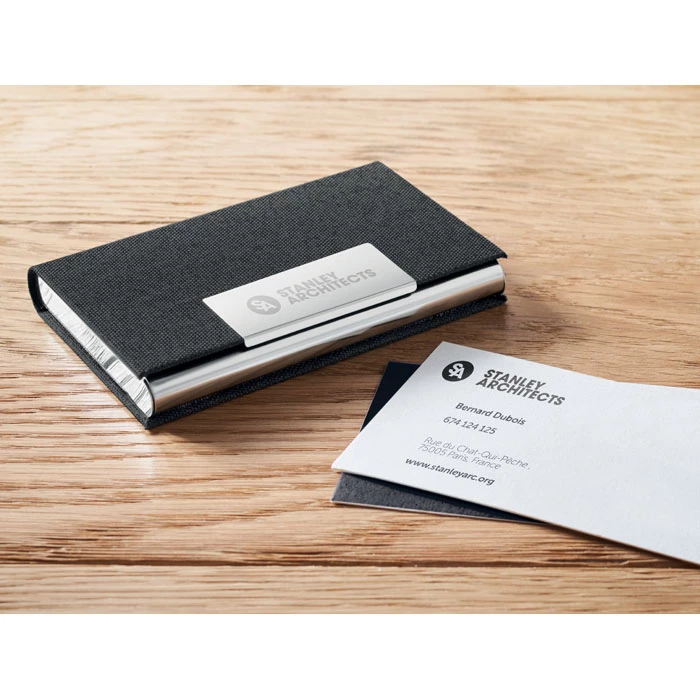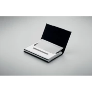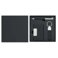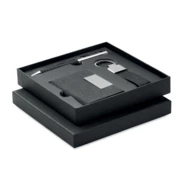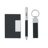 3-częściowy zestaw upominkowy w pudełku. Zawiera metalowy przekręcany długopis z detalami z poliestru RPET, brelok do kluczy z poliestru RPET i etui na karty z poliestru RPET z metalową płytką. Niebieski tusz.