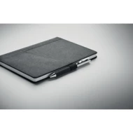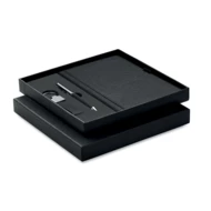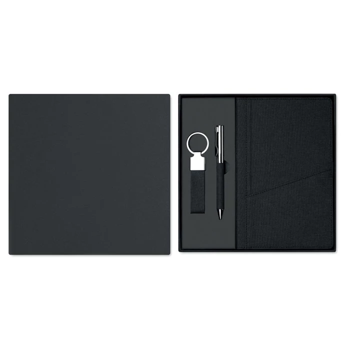3-częściowy zestaw upominkowy w pudełku. Zawiera metalowy przekręcany długopis z detalami z poliestru RPET, notes w twardej okładce RPET z przednią kieszenią na smartfon oraz brelok z poliestru RPET. Niebieski tusz. FSC MIX CREDIT | P7.1 | FSC-C213206