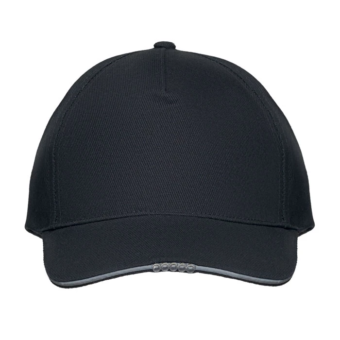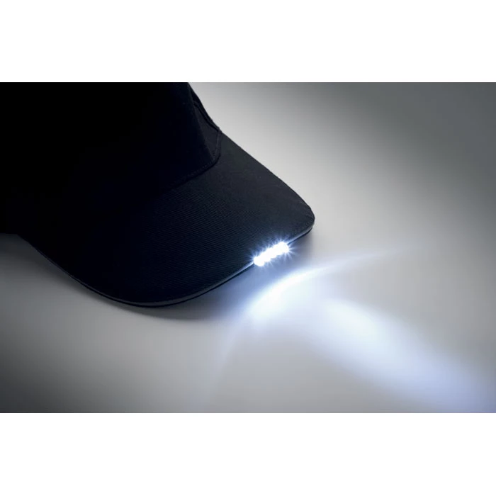 5-panelowa czapka z daszkiem z podświetleniem LED, wykonana z bawełny o gramaturze 220 gr/m² i wyposażona w metalową klamrę. Zawiera 1 kabel USB do ładowania.