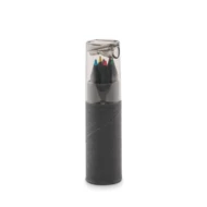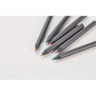 Pudełko z czarnego papieru zawierające 6 kredek do kolorowania i temperówkę w pokrywie.