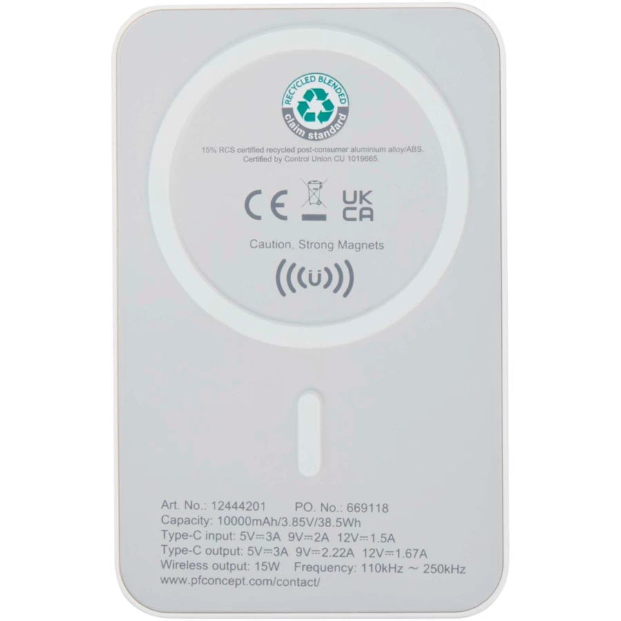 Acrab magnetyczny bezprzewodowy powerbank o pojemności 10 000 mAh i mocy 15 W z technologią 20 W PD — wykonany z tworzyw sztucznych pochodzących z recyklingu (NPC-12444201)