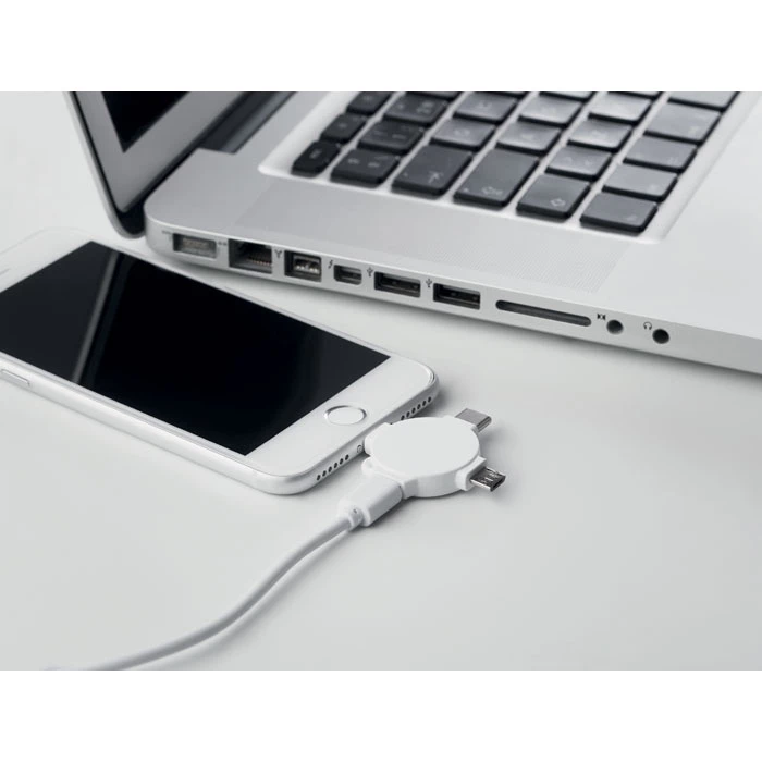 Kabel do ładowania 3 w 1 z 3 różnymi złączami, micro-USB, typ c oraz złączem dwustronnym. Nadaje się do urządzeń z systemem iOS i Android. Idealny do personalizacji w pełnym kolorze.