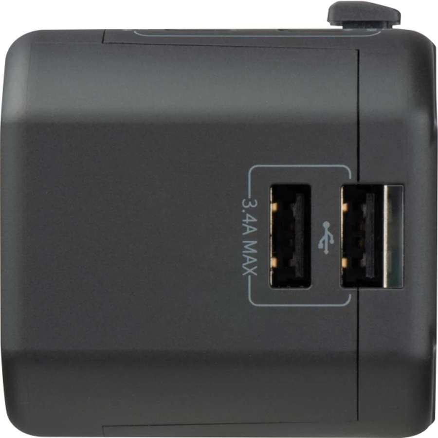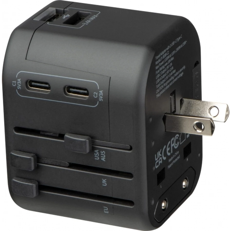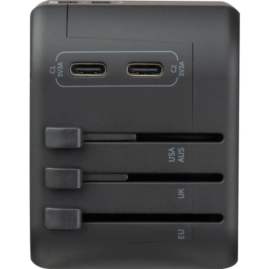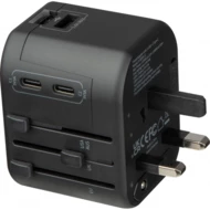 Adapter podróżny z wejściem 2xUSB, 2xUSB-C. Posiada końcówki odpowiednie dla krajów UE, UK i USA.