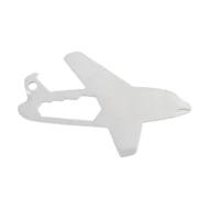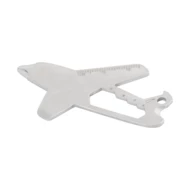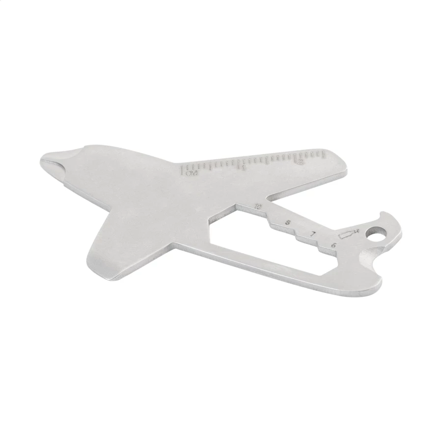 Wielofunkcyjny brelok w kształcie samolotu, wykonany ze stali nierdzewnej z recyklingu, wyposażony w otwieracz do butelek, linijkę, śrubokręt krzyżakowy i płaski, klucze imbusowe oraz obcinak do drutu.