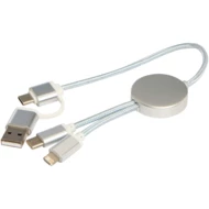 Kabel Alasia 5 w 1 do synchronizacji danych i szybkiego ładowania 27 W jest wykonany z eleganckiego i wytrzymałego aluminium pochodzącego z recyklingu oraz plastiku pochodzącego z recyklingu. Kabel jest wyposażony w złącze wejściowe USB-A i Type-C w połączeniu ze złączem wyjściowym Type-C oraz Lightning/Micro USB. Połączenie USB-A do USB-C zapewnia moc wyjściową maks. 27 W, a wszystkie inne opcje połączenia maks. 15 W. Akcesorium jest kompatybilne z CarPlay i Android Auto. Niezależnie od tego, czy jesteś w domu, w biurze czy w podróży, kabel Alasia zapewnia połączenie wydajności i stylu. Długość kabla: 30 cm.