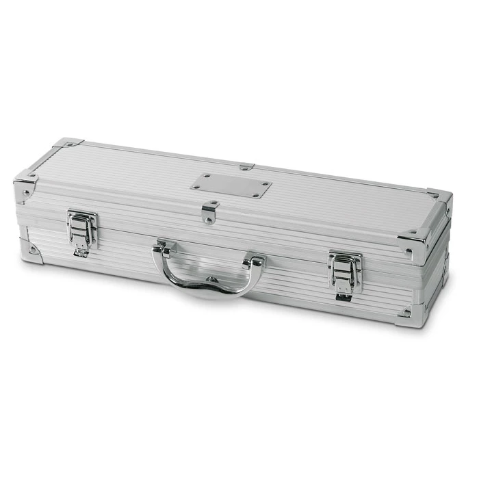 Aluminiowa walizka z 3 akcesoriami do barbecue ze stali nierdzewnej. Miejsce na nadrukowanie logo.