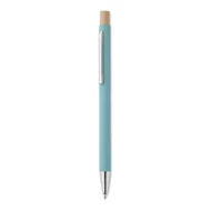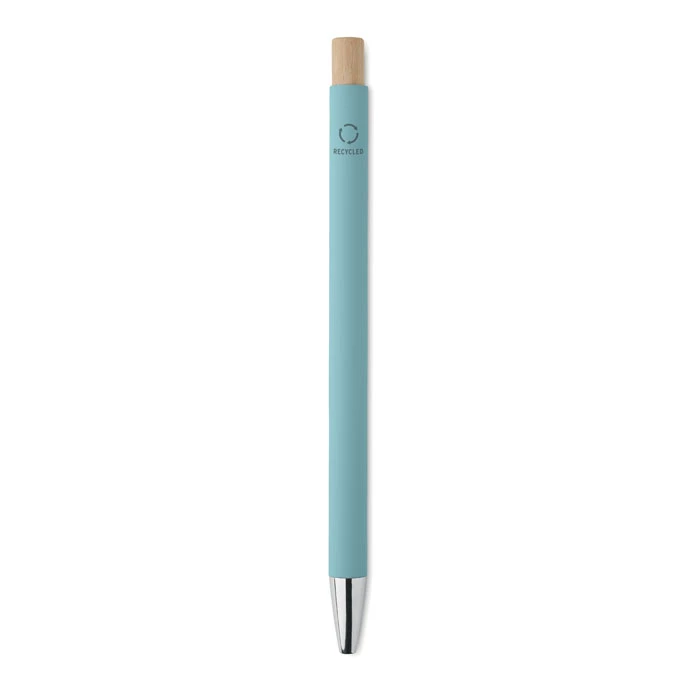Aluminiowy długopis z recyklingu. Srebrna końcówka i klip. Niebieski tusz.