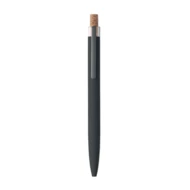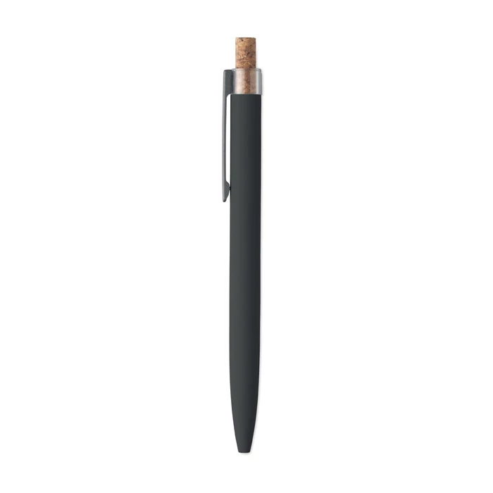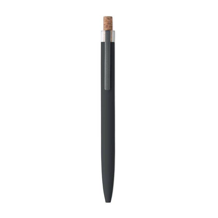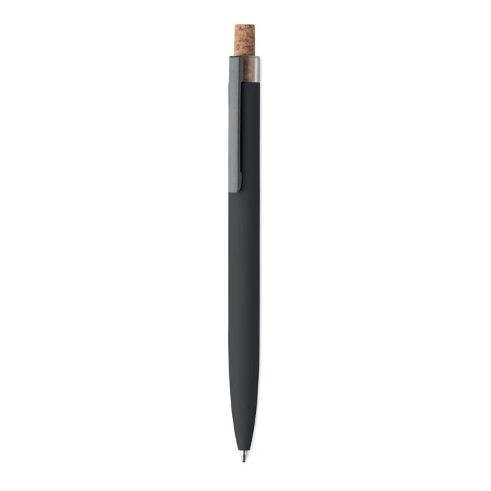 Długopis z aluminium pochodzącego z recyklingu z korkowym przyciskiem i metalowym klipem. Niebieski tusz.