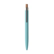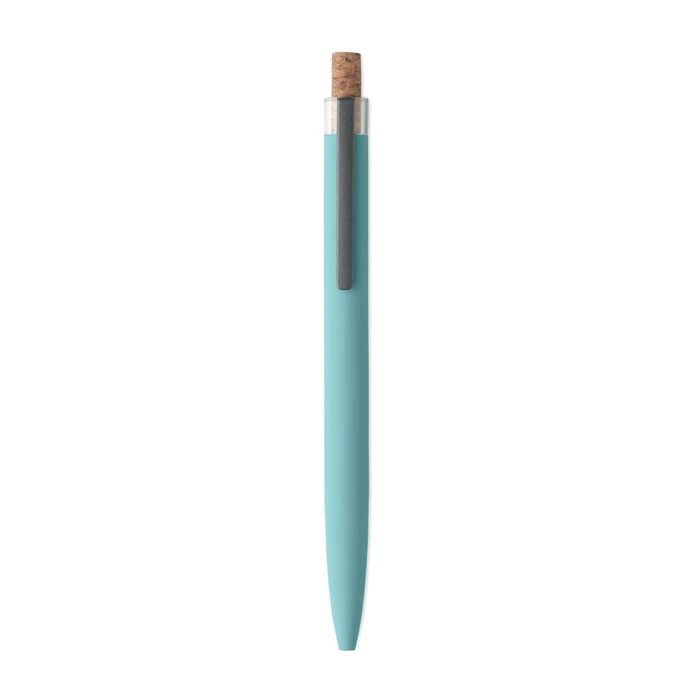 Długopis z aluminium pochodzącego z recyklingu z korkowym przyciskiem i metalowym klipem. Niebieski tusz.