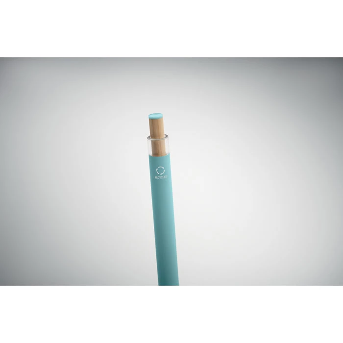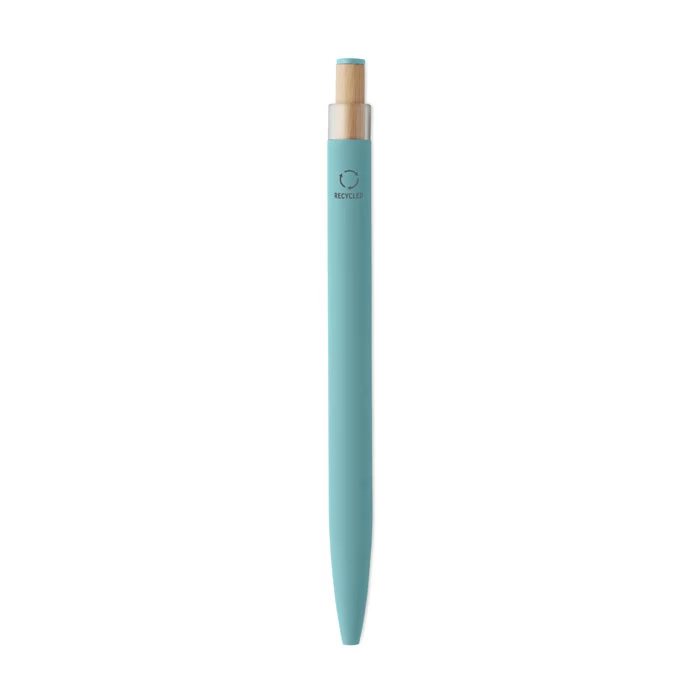 Aluminiowy długopis z recyklingu z bambusowym przyciskiem i dopasowanym kolorystycznie klipsem. Niebieski tusz.