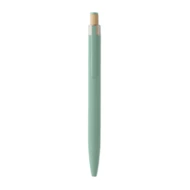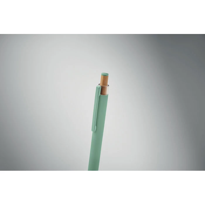 Aluminiowy długopis z recyklingu z bambusowym przyciskiem i dopasowanym kolorystycznie klipsem. Niebieski tusz.