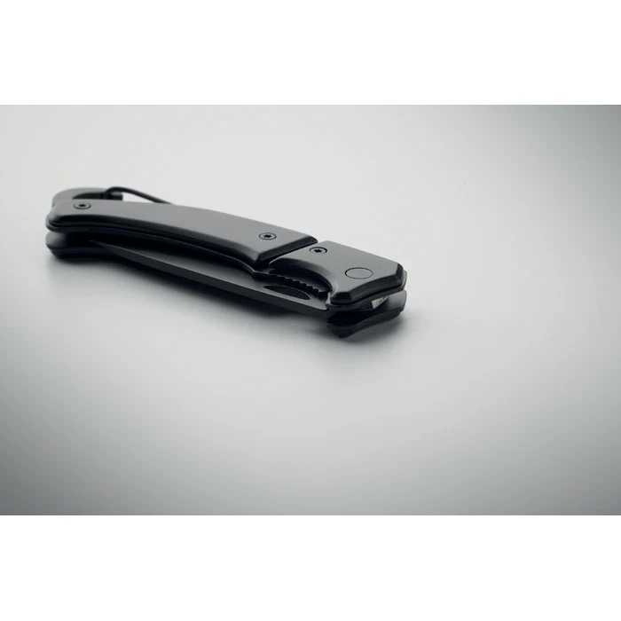 Aluminiowy nóż składany z karabińczykiem. Ostrze ze stali nierdzewnej. Karabińczyk nie służy do wspinaczki (nie do użytku profesjonalnego).