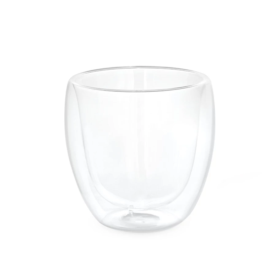Szklany kubek szkła borokrzemowego z podwójną ścianką izolowaną powietrzem, o pojemności do 220 mL. Dostarczany w pudełku prezentowym z możliwością personalizacji. ø80 x 86 mm