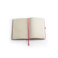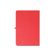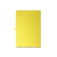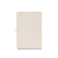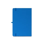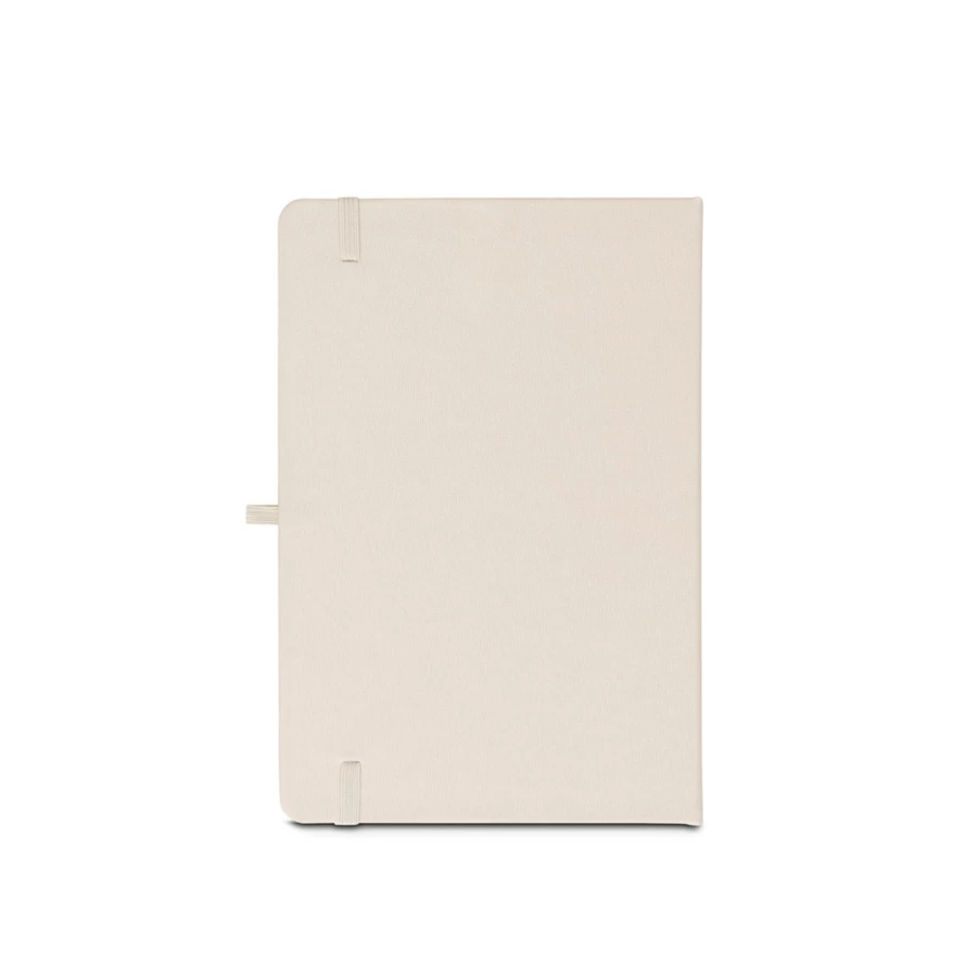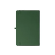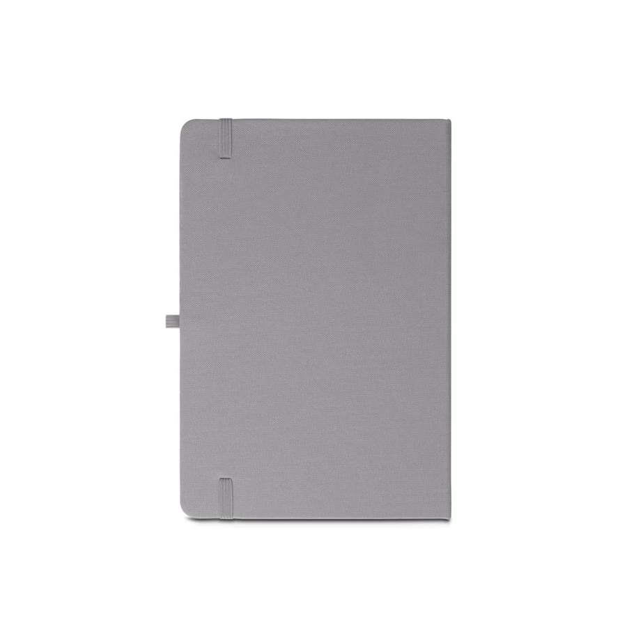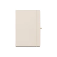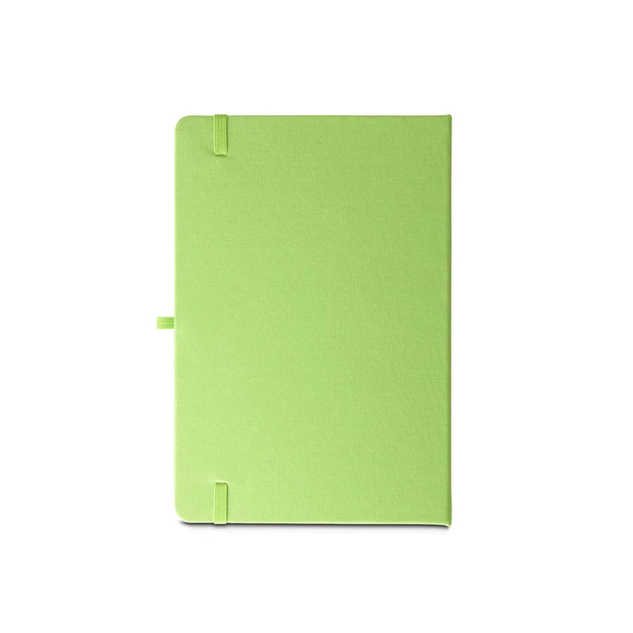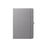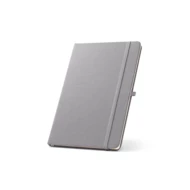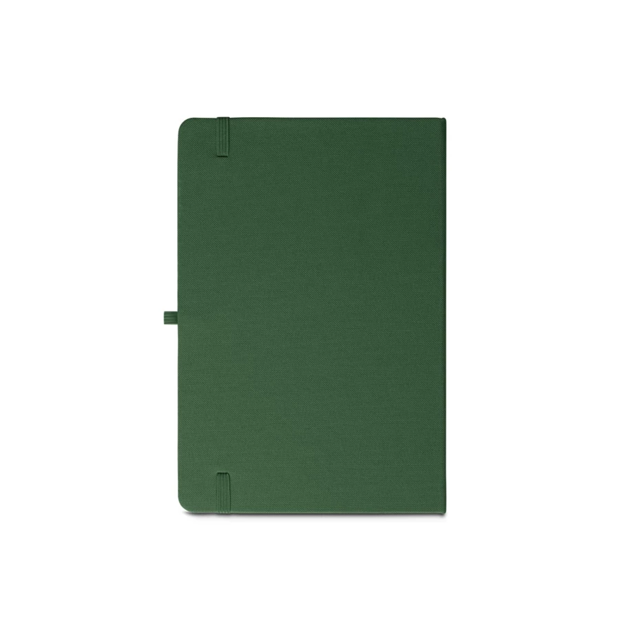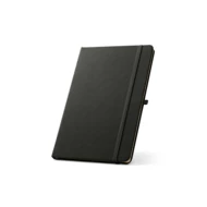 Notatnik A5 ze sztywną okładką wykonany z poliestru z recyklingu (100% rPET) 300D i zaokrąglonymi rogami. Zawiera 160 kartek w linie (70 g/m²) z papieru w 100% pochodzącego z recyklingu w kolorze kości słoniowej, pasek rozdzielający, uchwyt na długopis (brak w zestawie) i gumkę do zamykania. Symbol rPET jest wydrukowany w kolorze białym w dolnej części grzbietu. 143 x 211 mm