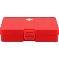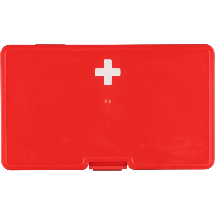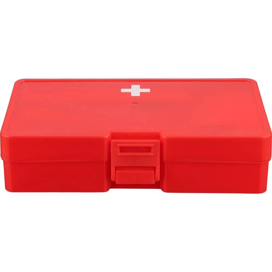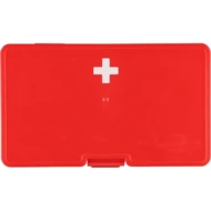 Apteczka, zapięcie na klips, czerwony pojemnik z białym krzyżem, gąbki (2 szt.), opatrunki (5 szt.), gaziki nasączone alkoholem (4 szt.), nożyczki, rolka bandażu (450 cm), taśma (450 cm), produkt wykonany z PP, PE i poliestru